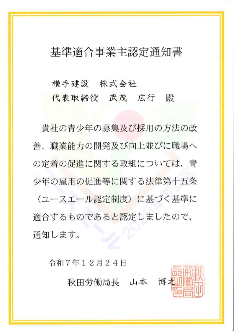 ![]() ![]() | ユースエール認定企業「ユースエール認定制度」(若者の採用・育成に積極的に取り組み、雇用管理の状況が優良である中小企業を厚生労働大臣が認定する制度)において認定を受け、1月13日にハローワーク横手の小笠原所長より認定証の交付を受けました。 |